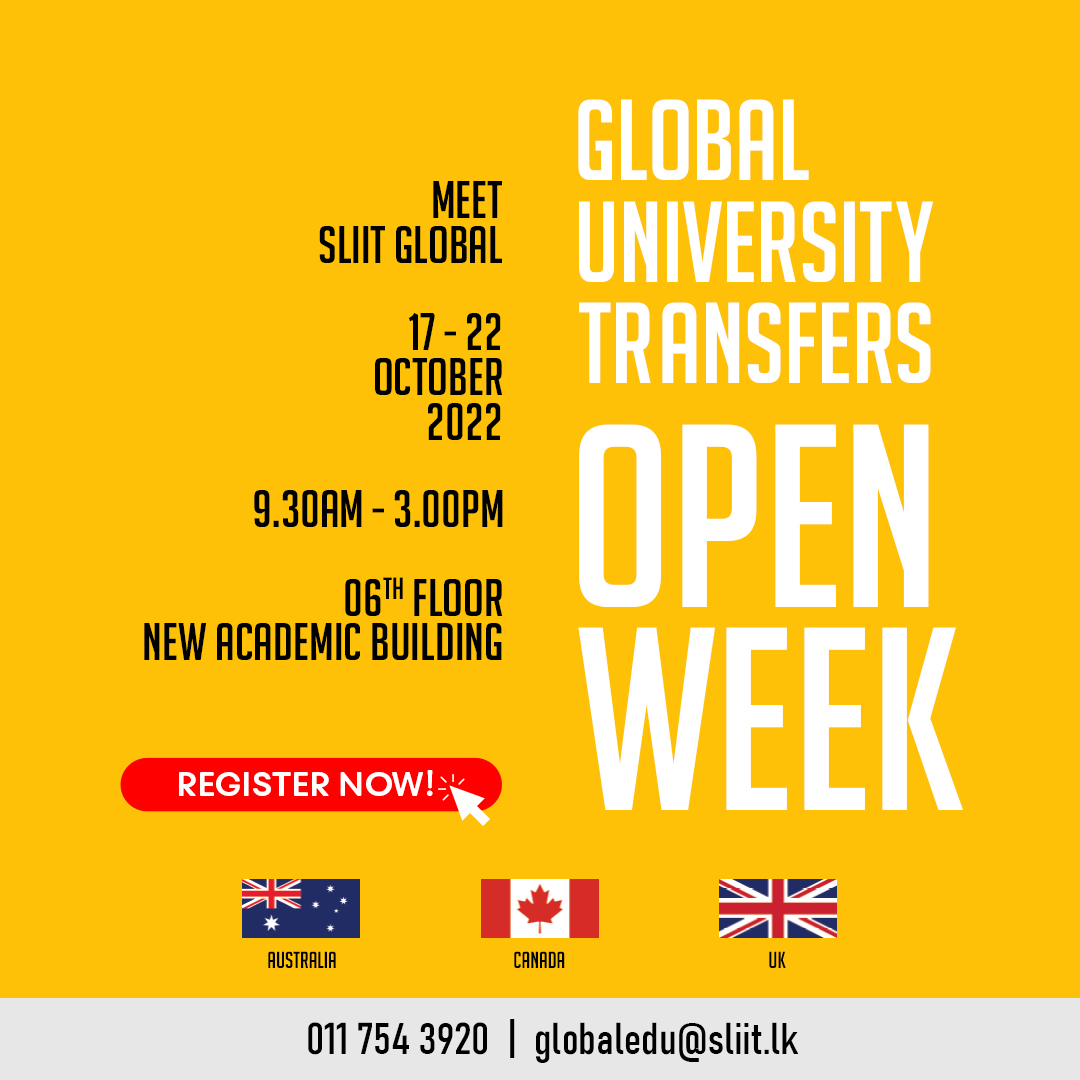 Join SLIIT Global Education Open Week happening from the 17th - 22nd of October from 9:30 am - 3:00 pm at SLIIT Global Education office.